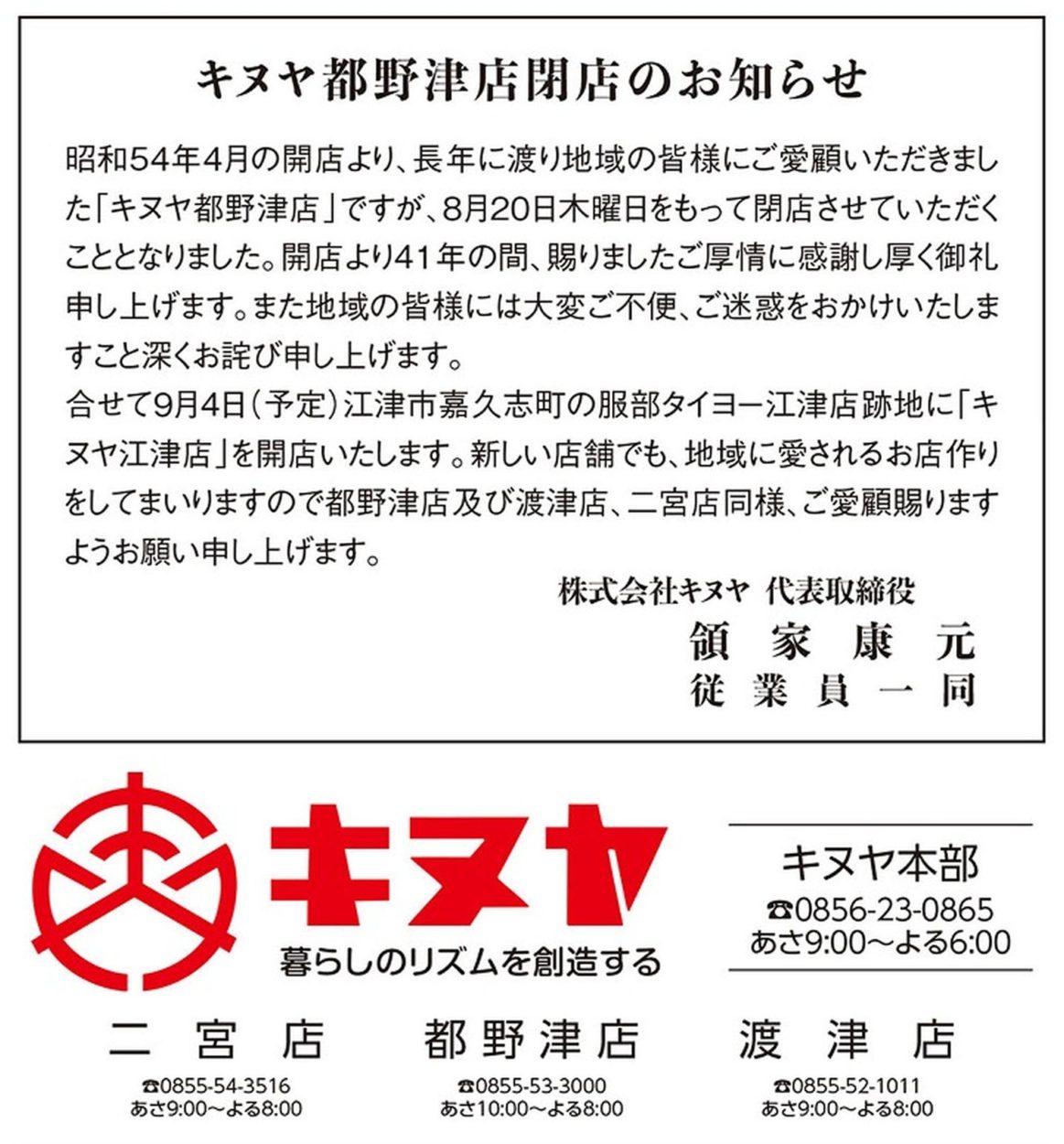 キヌヤ江津店(島根県江津市)2020年9月4日オープン予定。服部タイヨー跡地へ出店。キヌヤ都野津店は8月20日閉店