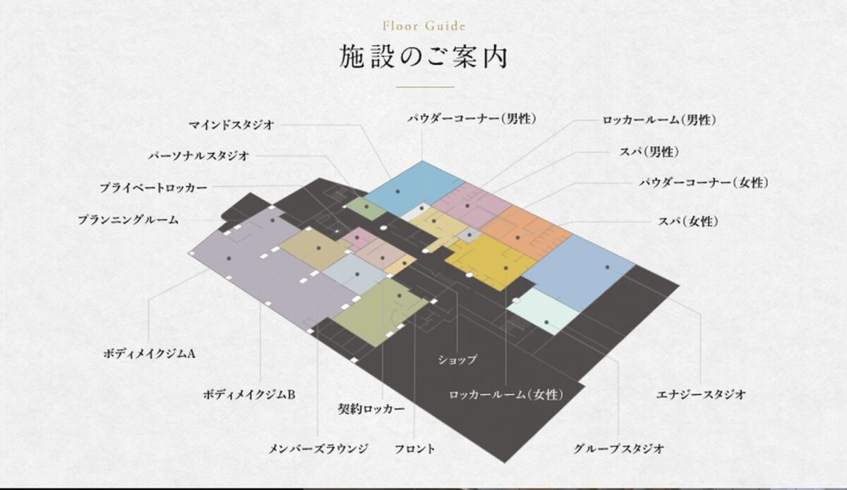 トレーニングジム、SKYスタジオ、溶岩ホットヨガスタジオ、VRサイクルスタジオ、ロッカールーム、シャワーエリア、フロント、ラウンジ