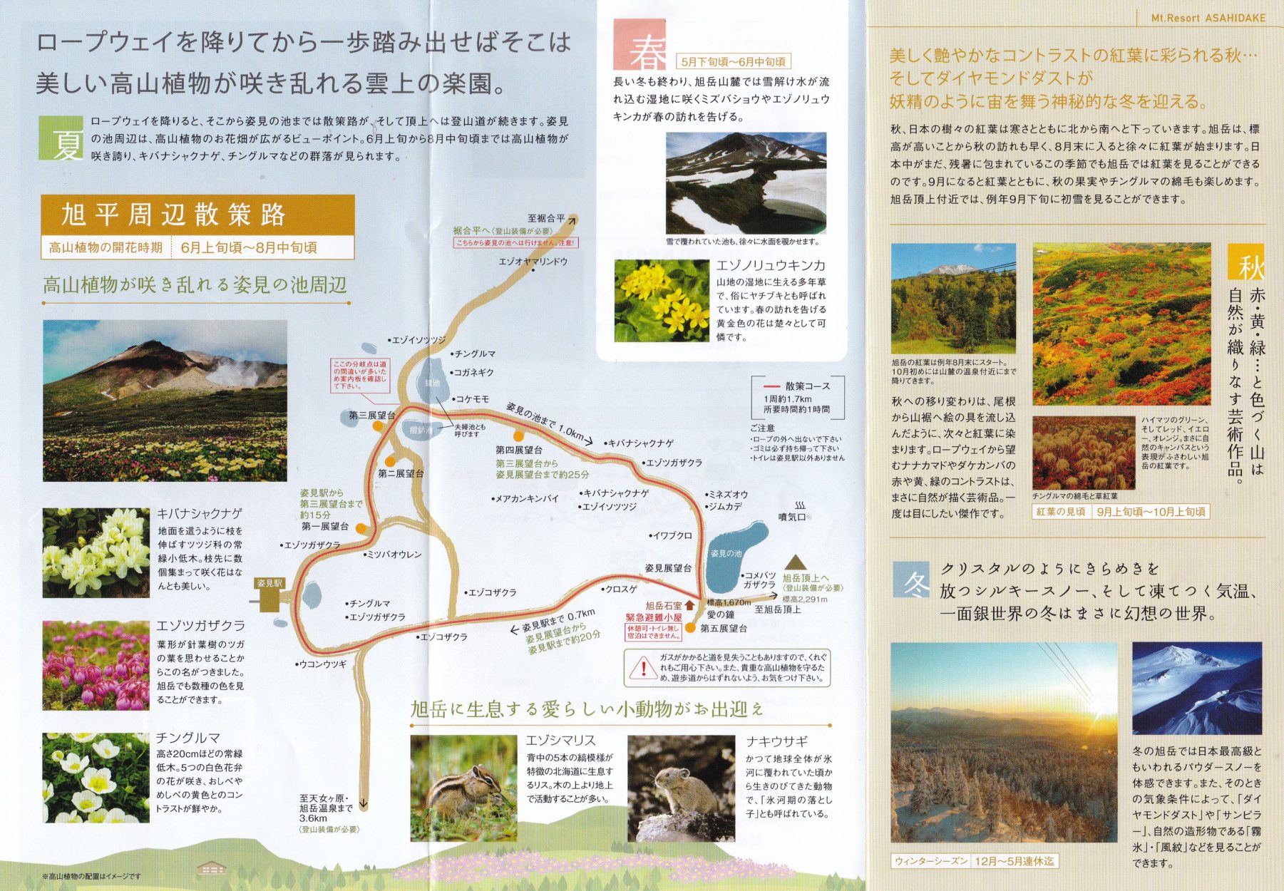 標高は2,291mと本州の山岳と比較して低いものの、森林限界は日本アルプスの2,500mから2,800m対して、旭岳は1,500mと低く、ロープウェイに乗車しながら森林限界を越えることができる。