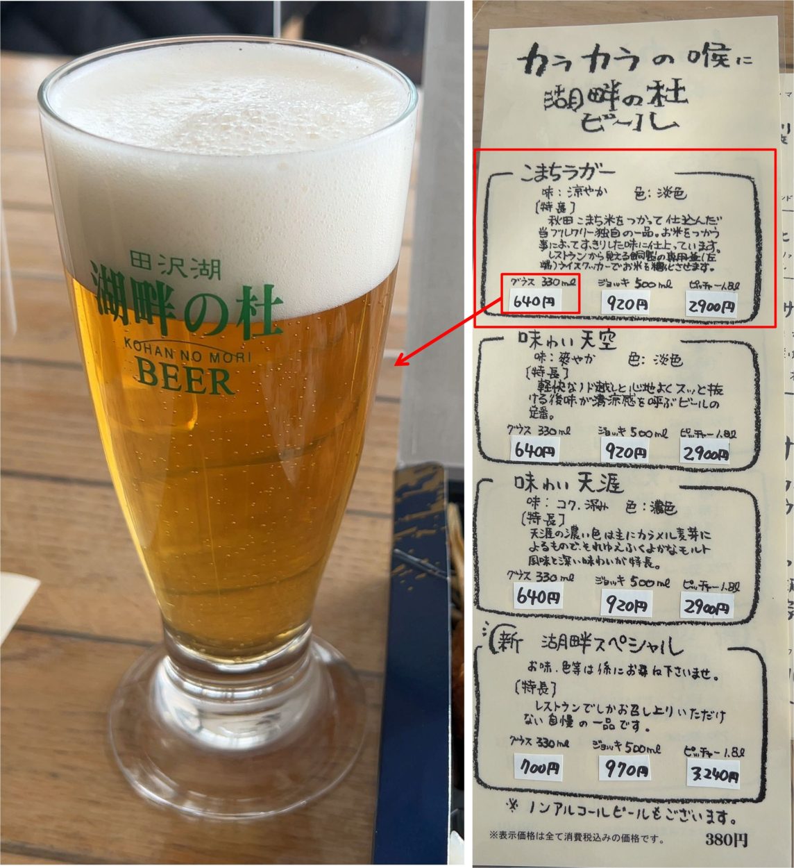 それでも、当店の心意気が十分、伝わってきた。良いですね。お礼に当店隣接醸造所製造の地ビールを注文。「あきたこまちラガー」。