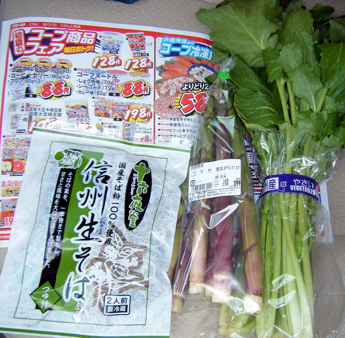 さて、購入商品。他のスーパーでも、ほとんどの店で品揃えされていた「更級十六夜堂の信州生そば」と店外で子供(青年含む)達が販売していた「うぐいす菜」。