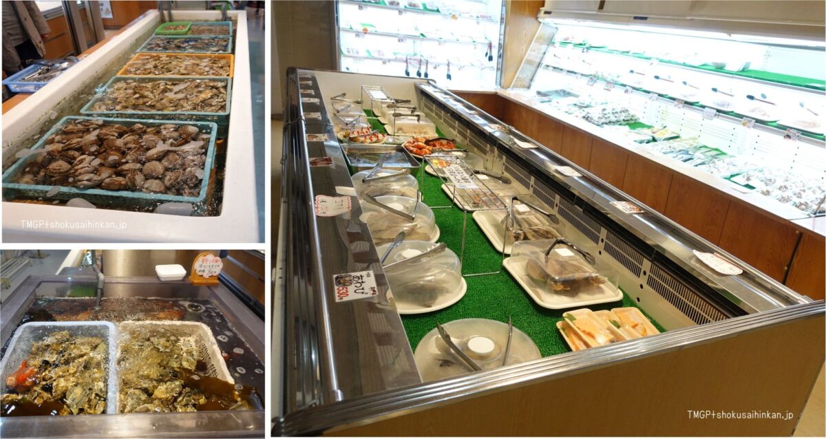 「隣接する魚介市場」は道の駅から見える厚岸大橋を渡った場所にある厚岸漁業協同組合地方卸売市場のことではなく、道の駅施設内の魚介類販売コーナーのことらしい。