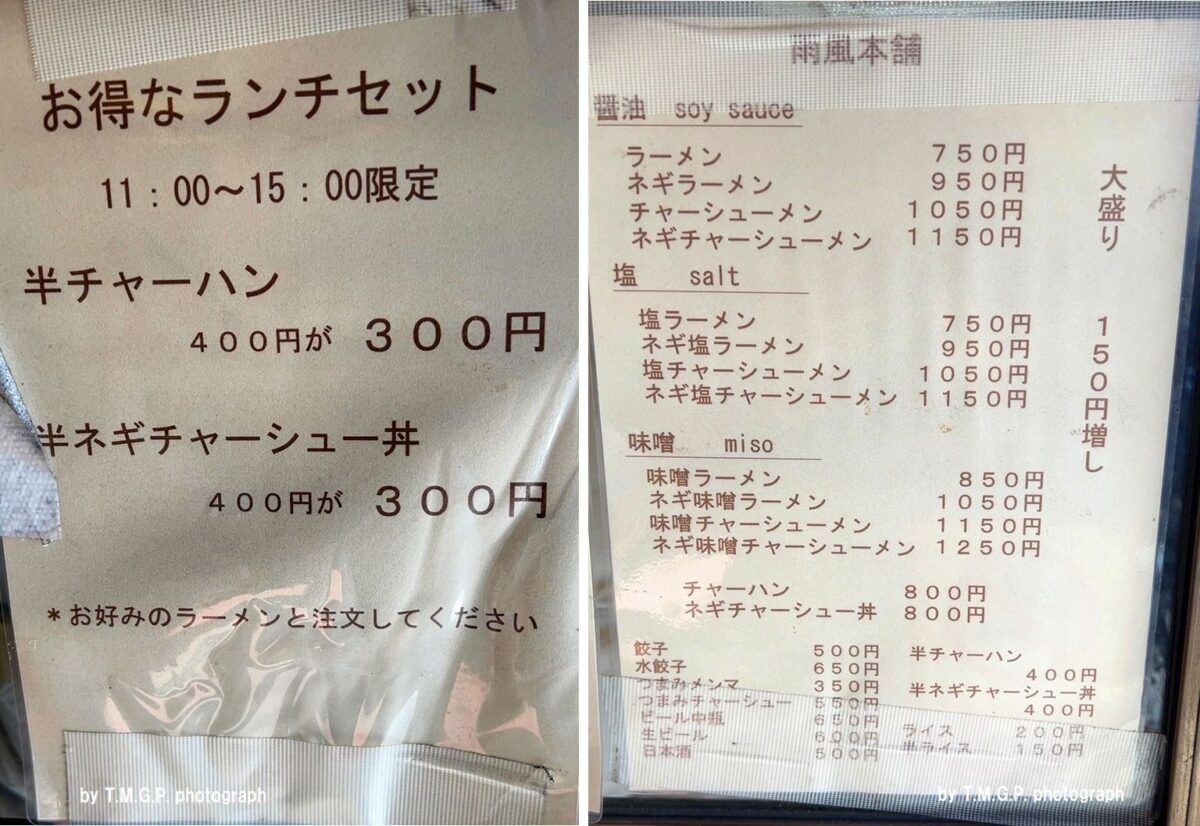 パートナー(妻)に塩をすすめる。理由は醤油以外の味も確かめたいという私のわがまま。もちろん、パートナーが選択決定。レンゲを2~3口すする。しかも時間を開けて。塩と醤油を行き来しながら味を確かめてみる。意外と塩も良いと思えるのはベースの元スープがしっかり作られているからかと。醤油の時よりも強く感じる主張しすぎない鶏と豚の存在と、そしてたまり醤油が隠していた煮干しもより強く感じる。★ラーメン750円プラス半チャーハン300円