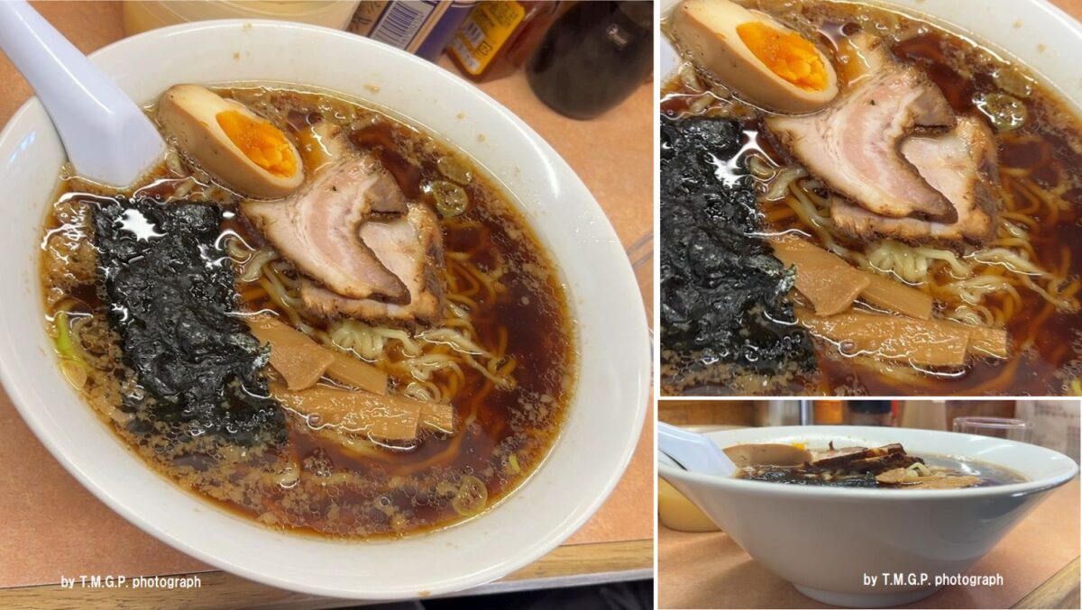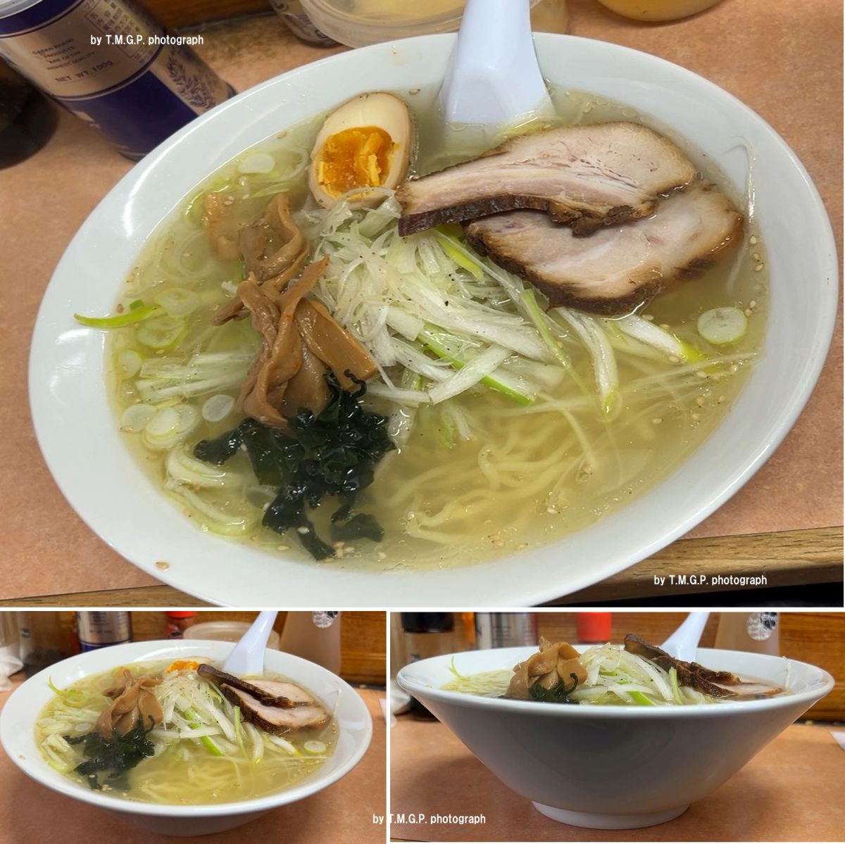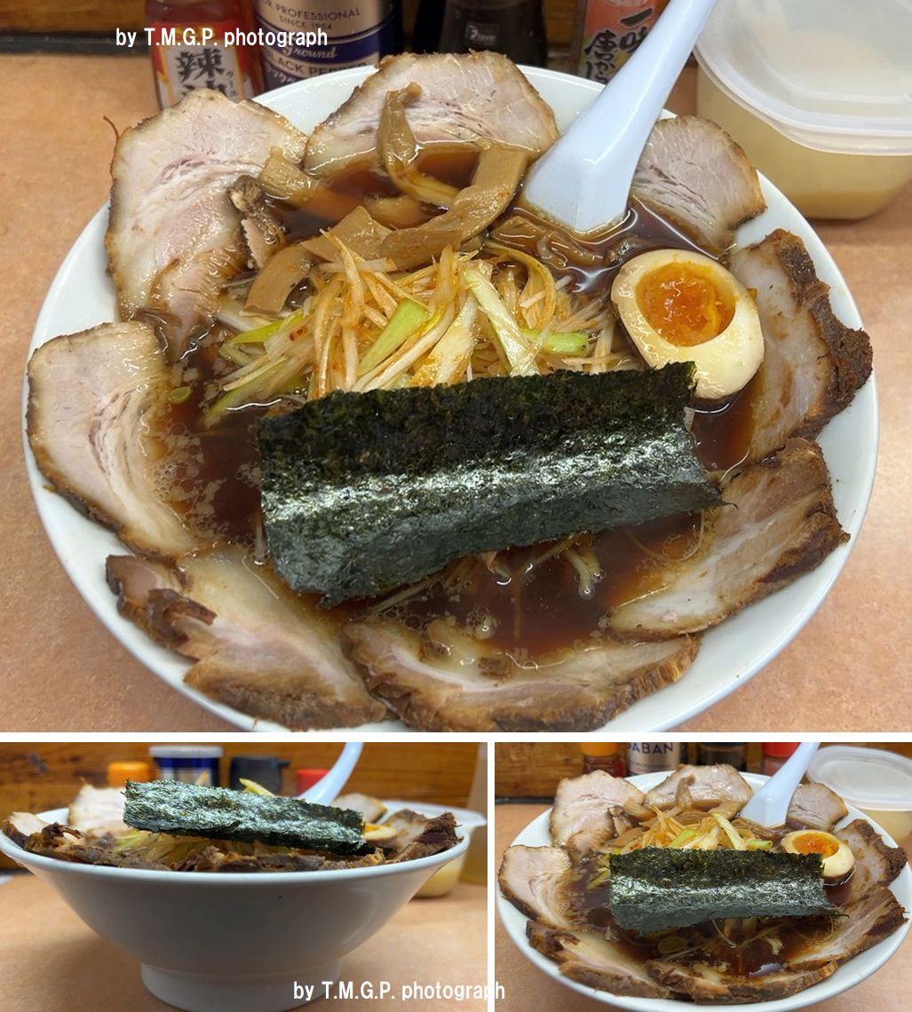 しまったと思ったのはネギに味付けされていることを提供されてから気づいたため。しっかりメニュー画像を確認しておくべきでした。結論からすると、このネギの味付けが邪魔をして美味しさを堪能できない。それでも食べ進めるうちに、あることに気づく。返しのたまり醤油の辛さがマイルド。通常の醤油(濃口・薄口・再仕込み)が大豆と小麦半々ということに対して、たまり醤油は大豆メインのため旨味がより豊富。そしてスープの奥に隠れている旨味成分が口中に溜まりだすと、ようやく本来の味を知ることができた。この隠れた元スープの旨味成分を感じないとこのラーメンの美味しさが理解できない。チャーシューはしっかり煮込みタイプで、苦手な低温調理肉ではないことが嬉しい。子供に肉を5~6枚食べてもらう。それでも背脂だけでない濃さがスープを完飲できない。もったいないがスープを少し残してしまった。★ネギ塩ラーメン950円
